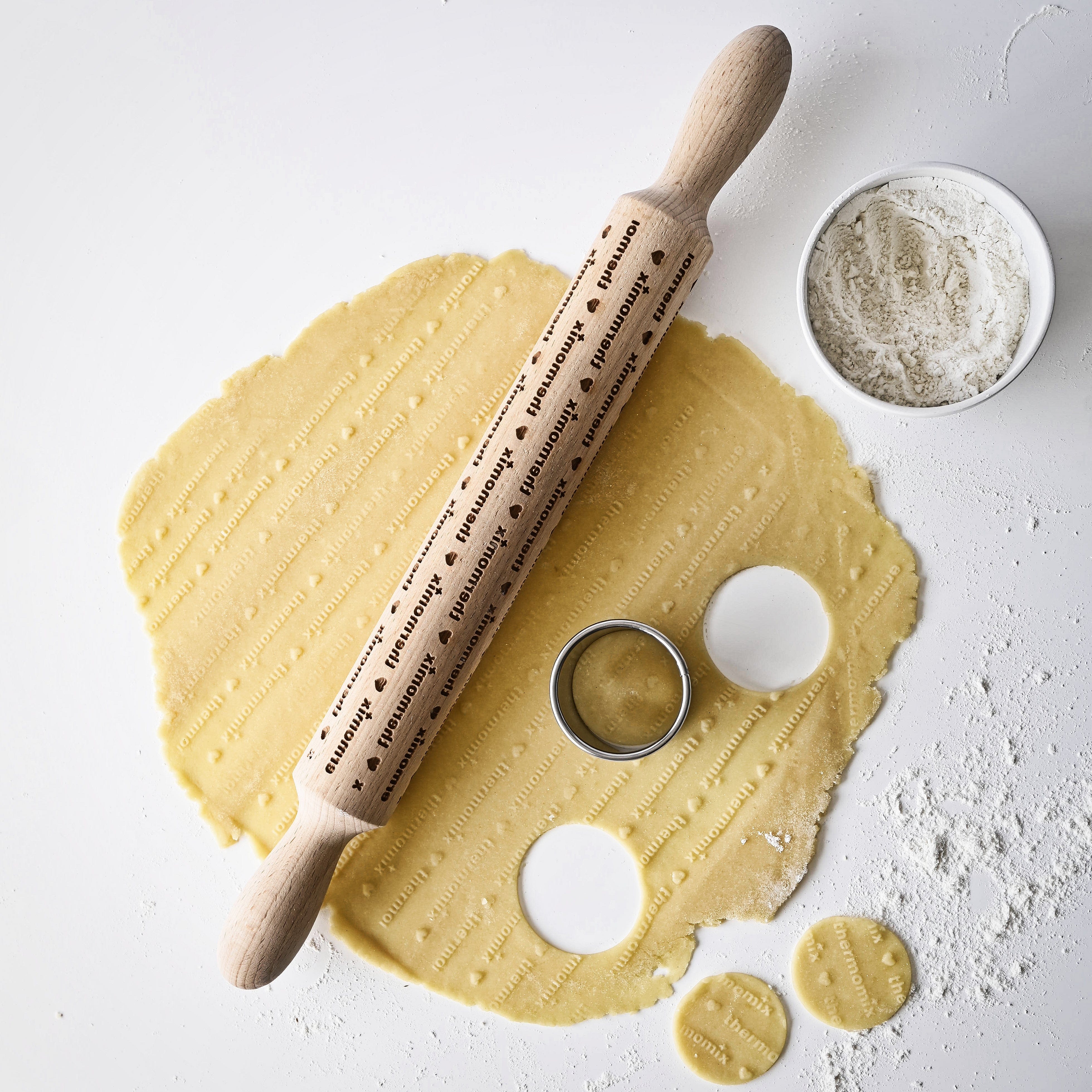 To emboss like a boss, roll out your dough with a regular, smooth rolling pin. We recommend the French Rolling Pin for ease, control and manoeuvrability. As soon as you’ve got your dough nice and flat and even, simply roll the Thermomix® embossed rolling pin over your dough once, applying medium pressure. The engravings will imprint a perfect Thermomix®-branded pattern that turns beautifully crisp and golden when baked, adding that personal finishing touch.